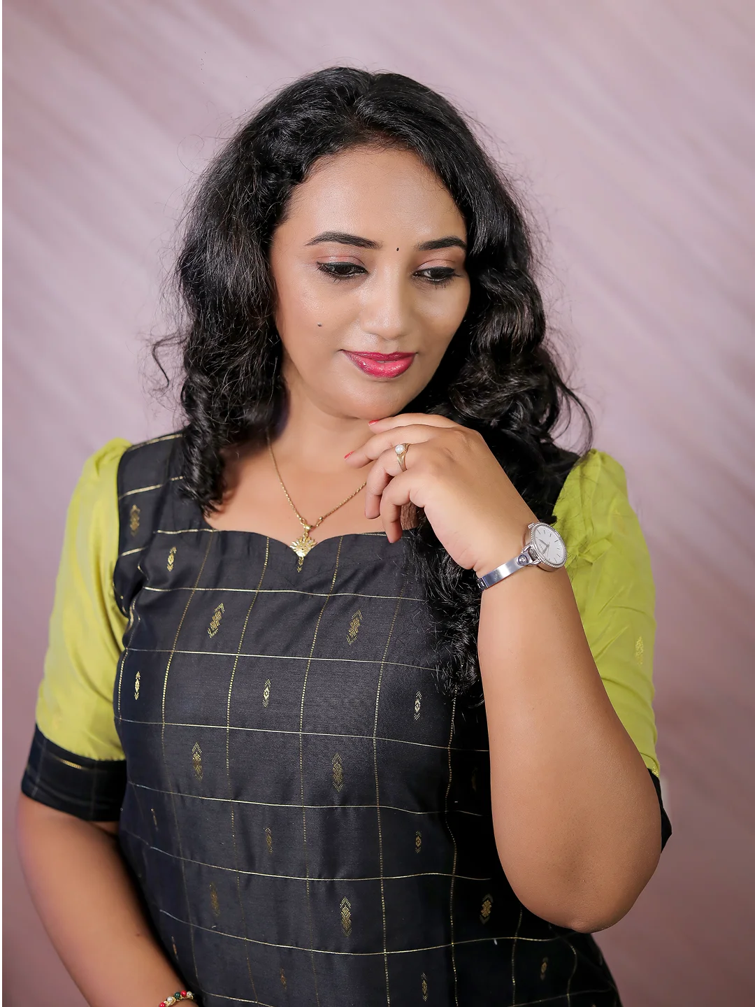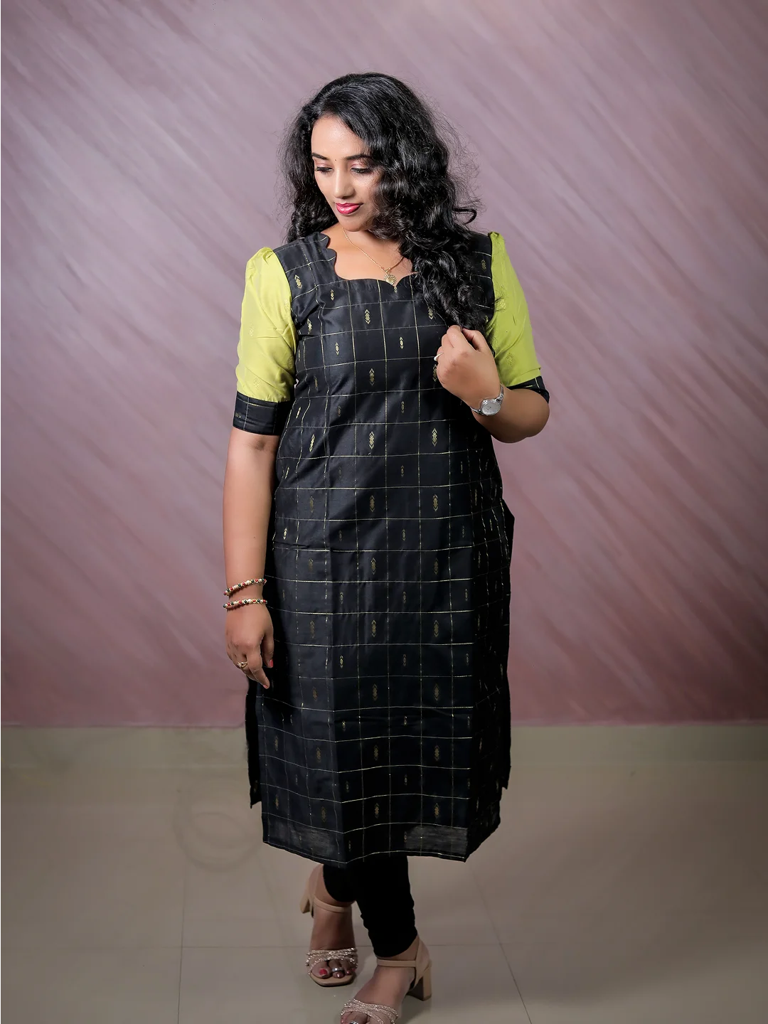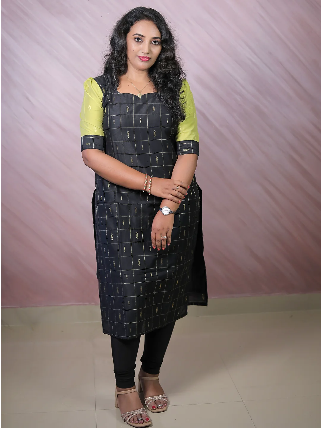 Premium kurti designed with raw silk fabric with cotton lining which gives long lasting and worth for casual / office and party wear. With side pocket and contrast Sleeves.