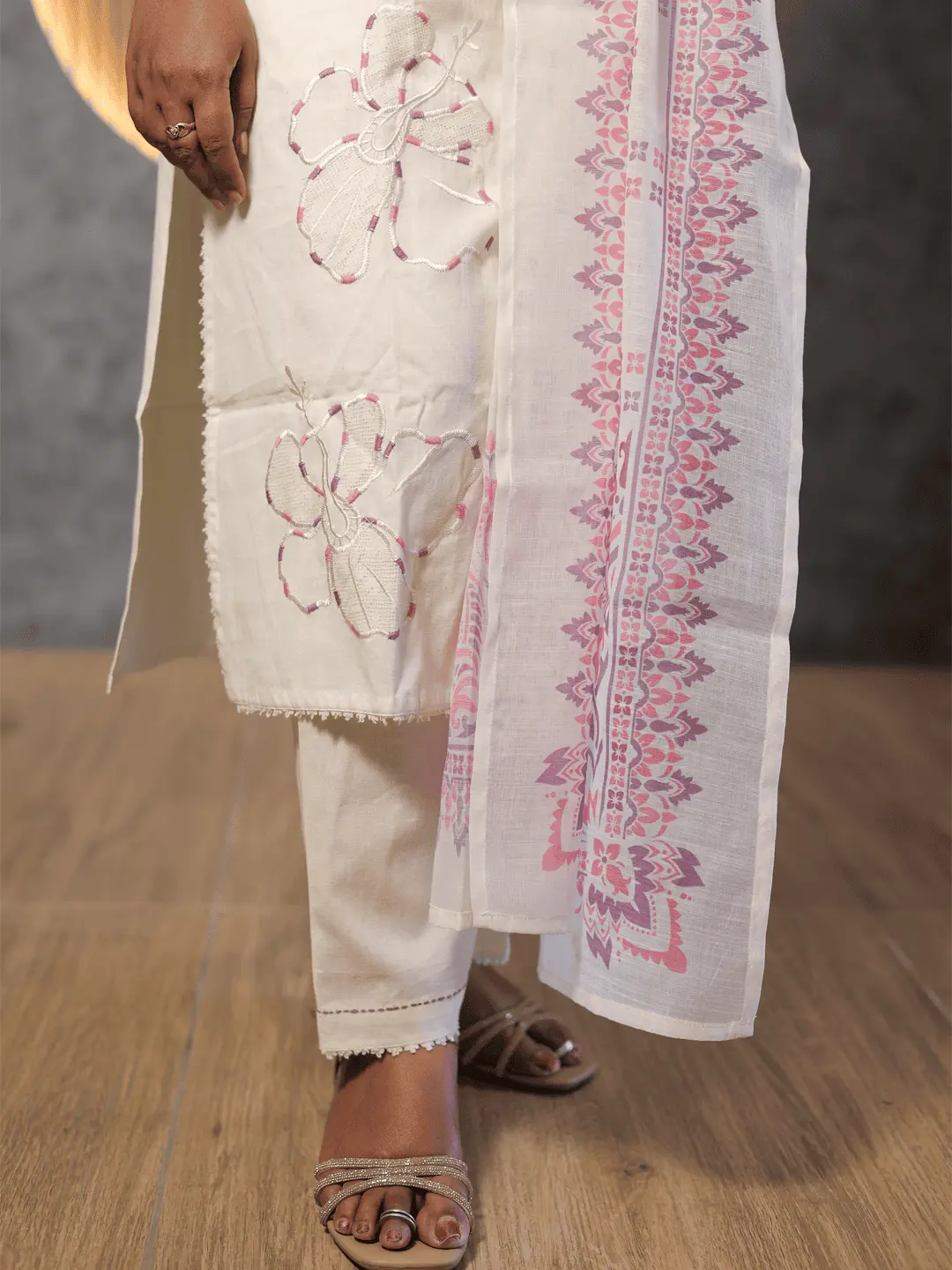 premium handloom cotton fabric , very premium look and embroidery work the top is the highlight. Crochet lace provided at the edges.